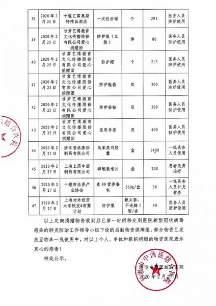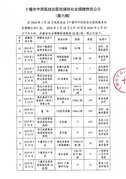 十堰市中西医结合医院接受社会捐赠物资公示(第六期)