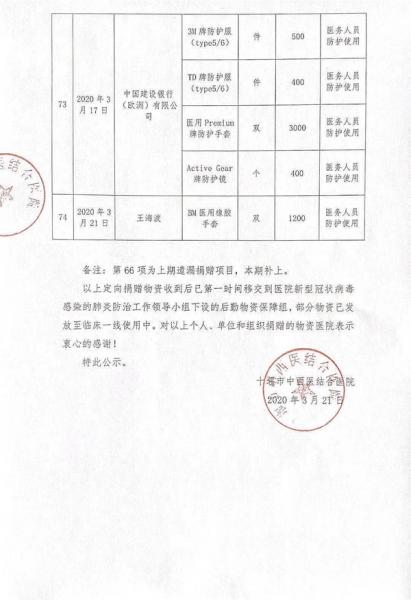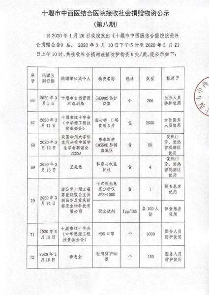 十堰市中西医结合医院接受社会捐赠物资公示(第八期)