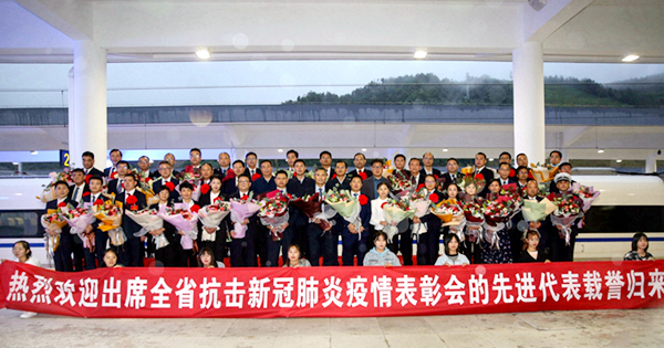 21日下午18时08分,我市赴武汉参加全省抗击新冠肺炎疫情表彰大会的先进个人、先进集体代表,胸前佩戴大红花,乘坐G6821次列车顺利抵达十堰东站,受到热烈欢迎。市委常委、宣传部长吴烨,市人大常委会副主任佘立柱,副市长王国恩,市政协副主席程登明到站迎接。书记吴云毅为荣获全省抗疫先进个人、优秀共产党员朱少铭送上鲜花。