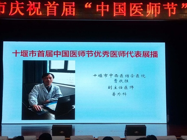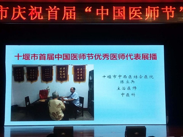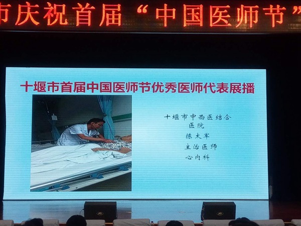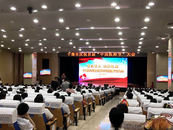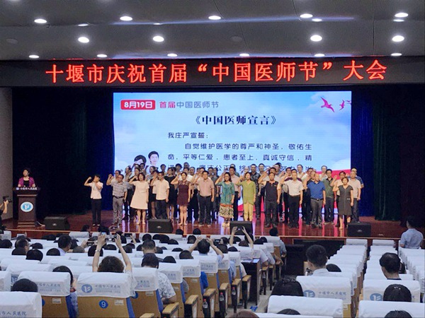 8月17日,在首届“中国医师节”即将到来之际,十堰市庆祝首届“中国医师节”大会召开,大会主题是“尊医重卫,共享健康”。市委常委、宣传部长、常务副市长周峰出席会议并讲话,副市长刘运梅主持会议,市政协副主席、市卫生计生委主任黄剑云致辞,市卫生计生委党组书记曹博宣读《致全市医师的一封信》。