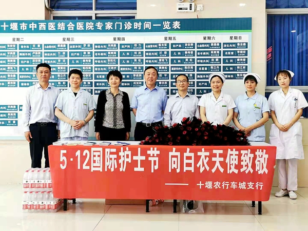 今年的5 月 12 日是第110个国际护士节,农行十堰分行纪委书记李星 、车城支行行长何辉等一行为我院护理人员敬献鲜花,送上节日的祝福,向白衣天使致敬。