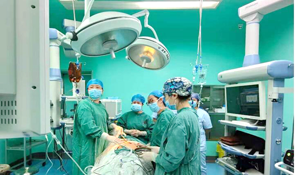 患者入院后完善相关辅助检查提示腹腔包块大小约22*17.5cm;三系减少,血小板仅34*109/L,合并有冠心病、肝硬化、脾功能亢进、低蛋白血症等。妇产科医护人员高度重视,结合患者高龄、病情危重等情况,立即报备医务科申请MDT会诊,为患者积极控制稳定基础疾病,并制定个性化治疗方案,最终患者及家属决定行腹腔镜下腹腔包块切除术。在由妇产科主任徐驰、涂安燕及主治医生马芳组成的手术团队与麻醉医生的配合下,蔡奶奶顺利完成腹腔镜下患侧附件切除手术,切除的包块重量约达6斤。术后蔡奶奶在ICU观察不到24小时即转入普通病房,各项生命体征平稳。因为是腹腔镜微创手术,创伤小、出血少、恢复快,在医护团队的精心护理下,蔡奶奶术后第二天就能下床活动了,术后病检报告显示单纯性卵巢浆液性囊腺瘤,为卵巢良性肿瘤。看着蔡奶奶日渐康复,不日就可出院,家属向妇产科医护人员表达了真诚的感谢!