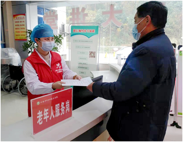 推行医务人员导医导诊志愿服务。医院在门诊预检分诊、挂号、交费窗口、新冠疫苗接种点、入出院办理处等老年人就医容易发生不便的环节,织密助老服务网络,设置清晰标识的“助老服务点”,各科室采用接力式服务,安排、增加医务人员、志愿者为就医不便的老年人提供引导帮助,协助指引老人查验健康码、挂号、缴费、接种扫码建档,快捷办理入出院手续,为需要帮助的老年患者就诊各流程提供闭环式连续服务,有效缩短了老人等候时间。