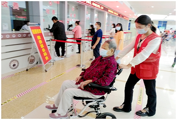 ▲导医、志愿者全程陪同行动不便老年病人就医