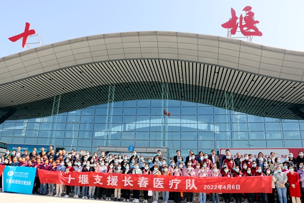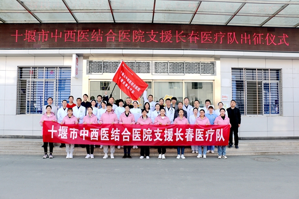 在出征仪式上,院领导为支援长春医疗队授旗,并做了动员讲话,本次跨省支援开展救治工作,任务艰巨,使命光荣,是对医院的一次检验和考验,队员们一定要努力工作,彰显十堰及中西医人形象。